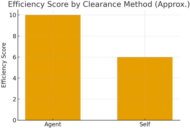 - The highest score is using a customs agent (~10/10), which enables the best and smoothest process.