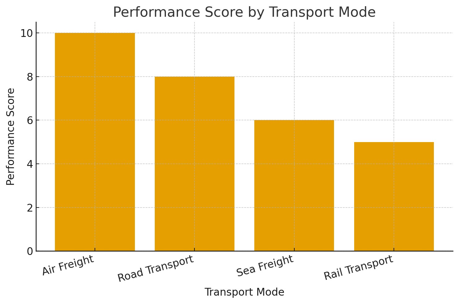 - Sea Freight is at the middle point with a score of 6, which is indicative of a stable performance but slower delivery cycles than those of air and road.