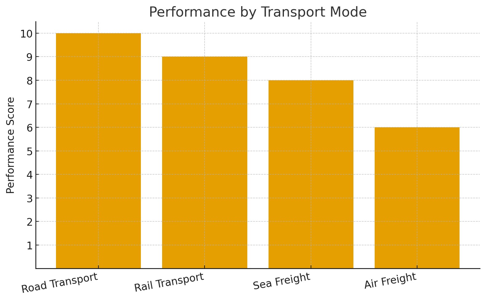 - Road transport is the transport mode with the highest score, 10, and is viewed as the best performer.